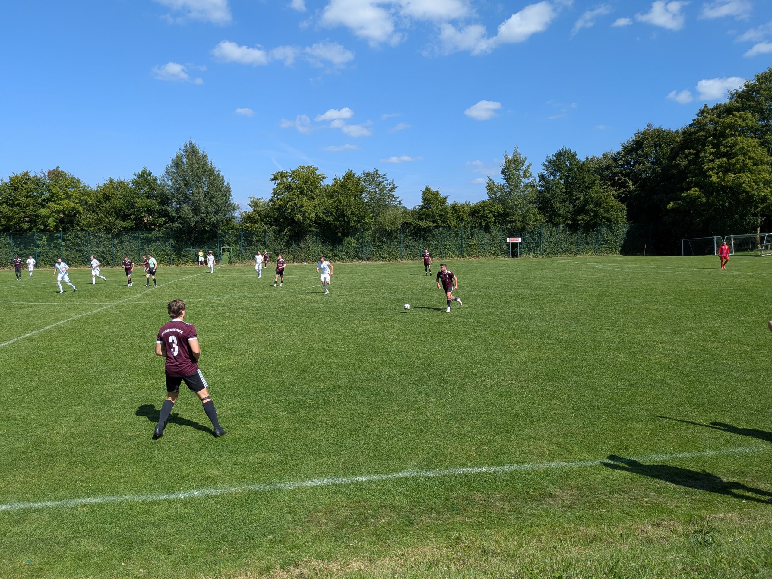 Mit ruhigem und konzentriertem Aufbauspiel begann die Erste das Spiel und war optisch deutlich überlegen. Die Gäste mussten bereits früh die Bälle schlagen. Nach und nach erspielte sich das Team von Lars Urban auch Chancen. Nach einer halben Stunde hatten die mehr als 100 Zuschauer schon den Torschrei auf den Lippen, doch der Lupfer des steil geschickten Tim Wäller landete an der Latte und der Nachschuss ging zum Entsetzen der Zuschauer über den Querbalken. In der 37. Minute wurde der flinke Mehdi Derouiche mit einem Steckpass bedient, scheiterte aber im anschließenden 1-gegen-1 am starken Keeper der Gäste. Kurz vor der der Halbzeit war es Dunia Kineke, der einen Kopfball nach einer Ecke knapp zu hoch ansetzte.