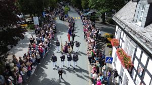 Im Anschluss erfolgten in der Schützenhalle die Ansprachen des 1. Brudermeisters und der geladenen Ehrengäste und Gratulanten. Einen besonderen Moment bescherte das Tambourkorps, das das von der Bruderschaft geschenkte Musikstück in der Schützenhalle uraufführte und zumindest bei den Grafschaftern Lust zum Mitsingen und auf Geyseke aufkommen ließ. Auch im Zelt, was auf dem Schützenplatz aufgebaut war, herrschte eine tolle Stimmung.