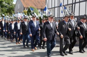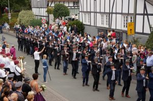 Am Sonntagmorgen traten die Schützen in der Dorfmitte am Haus des Gastes an, um zum Schützenhochamt in die Pfarrkirche zu marschieren. Nach der von Pastor Stipp gehaltenen Messe führte der Weg zurück zum Dorfbrunnen, wo der Musikverein Berghausen ein Frühschoppenkonzert spielte.
