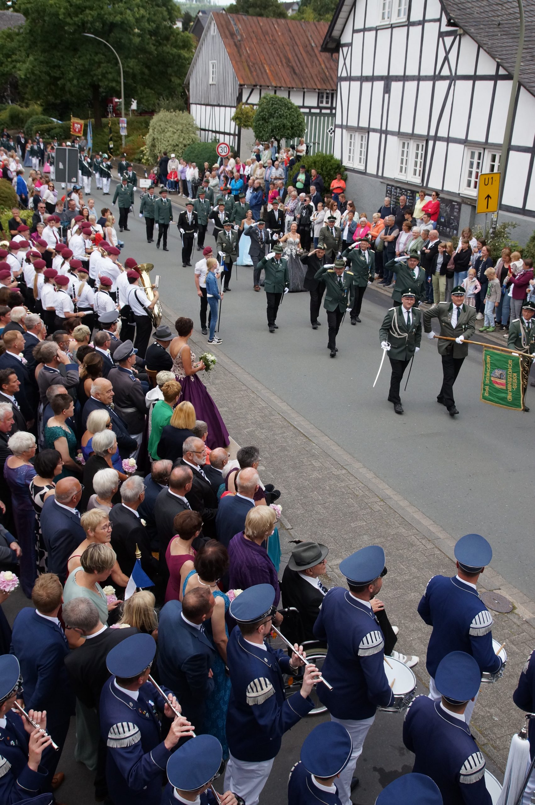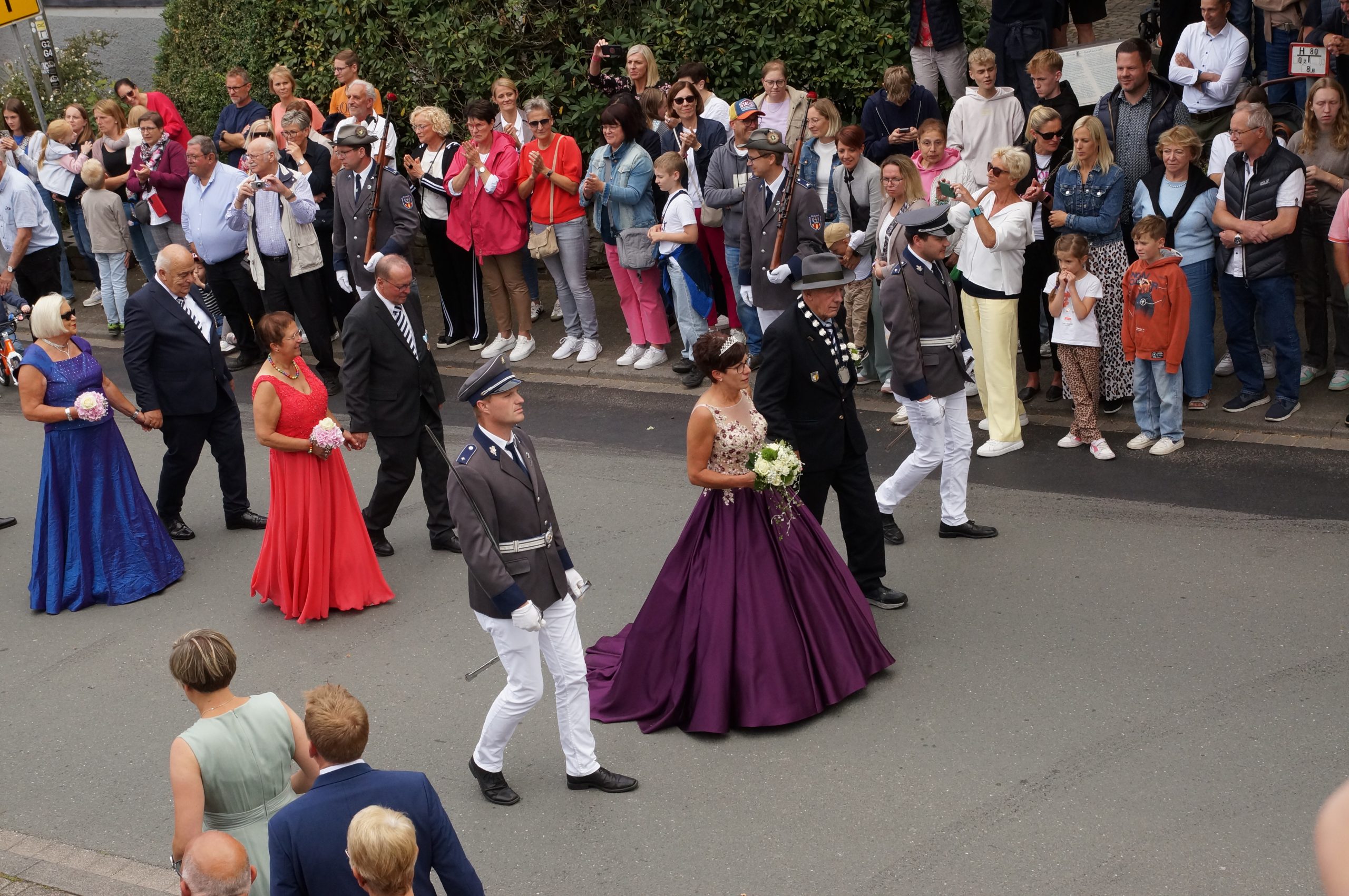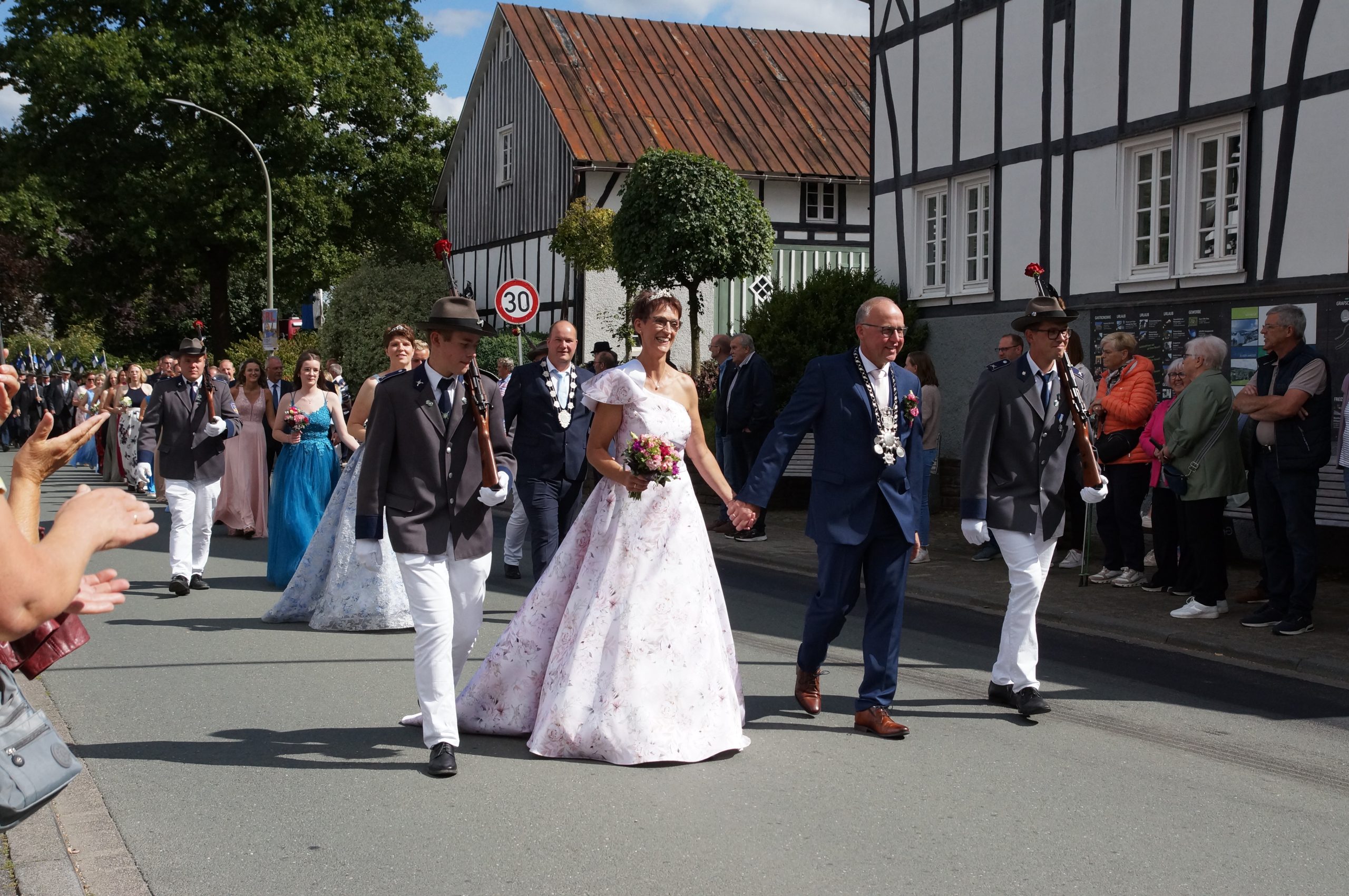 Wenig später trafen bereits die ersten eingeladenen Gastvereine und Musiken an der Schützenhalle in der Schulstraße ein, wo sich pünktlich um 14.30 Uhr der aus drei Zügen bestehende Große Festzug in Gang setzte. Knapp 1.000 Teilnehmerinnen und Teilnehmer sorgten für ein imposantes Bild. Am Haus des Gastes wurde der neue Kaiser Helmut Dohle, den seine Tochter Sabine als Kaiserin begleitete, und der aus ehemaligen Königen bestehende Hofstaat abgeholt. Bei sommerlichem Kaiserwetter führte der Festzug durch das Klostergelände, um sich im Dorf abermals den Zuschauern zu präsentieren, die die Straße auf beiden Seiten in mehreren Reihen säumten. Nach der Kehrtwende in der Nähe der Ortsausfahrt Oberkirchen erfolgte vor dem Hof Höwer (Olbes) ein Vorbeimarsch zu Ehren des neuen Kaisers und seines Hofstaates.
