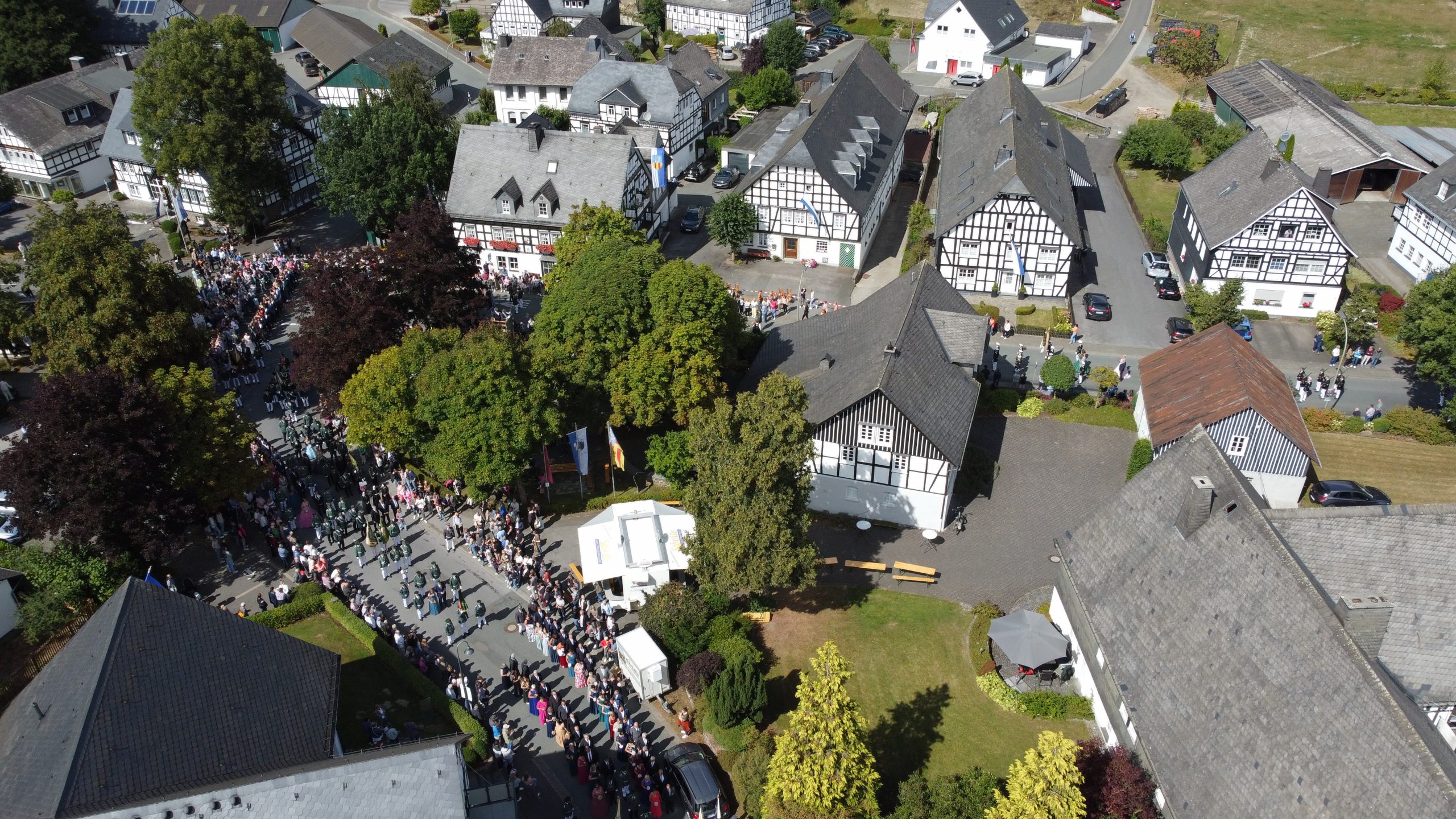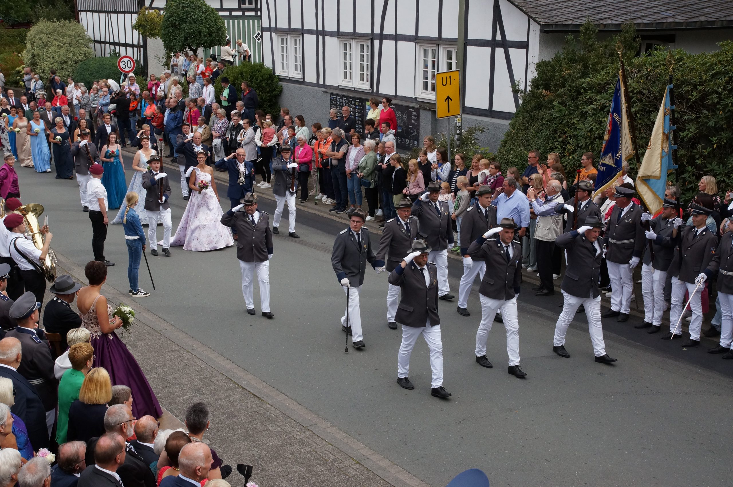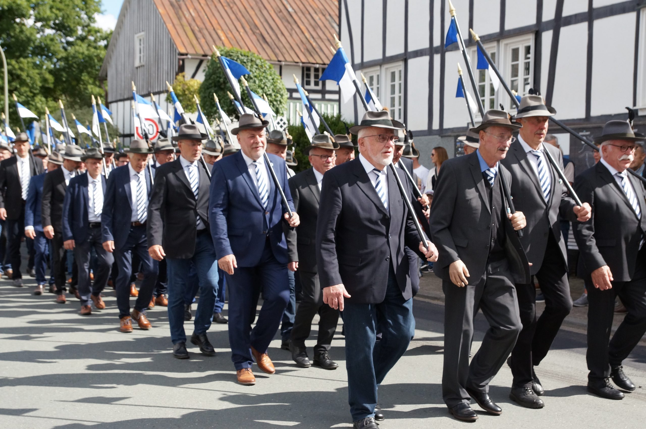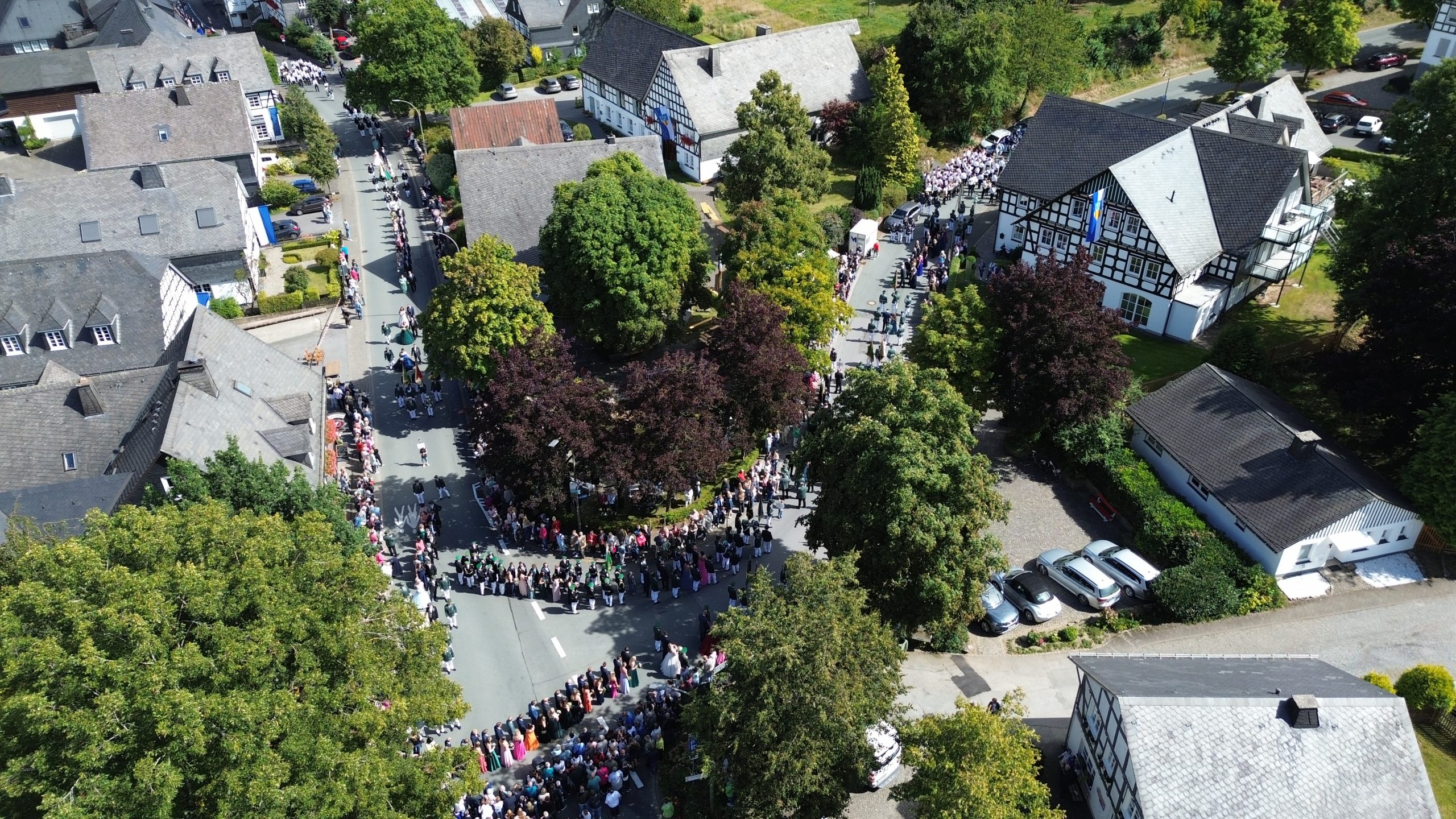 Wenig später trafen bereits die ersten eingeladenen Gastvereine und Musiken an der Schützenhalle in der Schulstraße ein, wo sich pünktlich um 14.30 Uhr der aus drei Zügen bestehende Große Festzug in Gang setzte. Knapp 1.000 Teilnehmerinnen und Teilnehmer sorgten für ein imposantes Bild. Am Haus des Gastes wurde der neue Kaiser Helmut Dohle, den seine Tochter Sabine als Kaiserin begleitete, und der aus ehemaligen Königen bestehende Hofstaat abgeholt. Bei sommerlichem Kaiserwetter führte der Festzug durch das Klostergelände, um sich im Dorf abermals den Zuschauern zu präsentieren, die die Straße auf beiden Seiten in mehreren Reihen säumten. Nach der Kehrtwende in der Nähe der Ortsausfahrt Oberkirchen erfolgte vor dem Hof Höwer (Olbes) ein Vorbeimarsch zu Ehren des neuen Kaisers und seines Hofstaates.