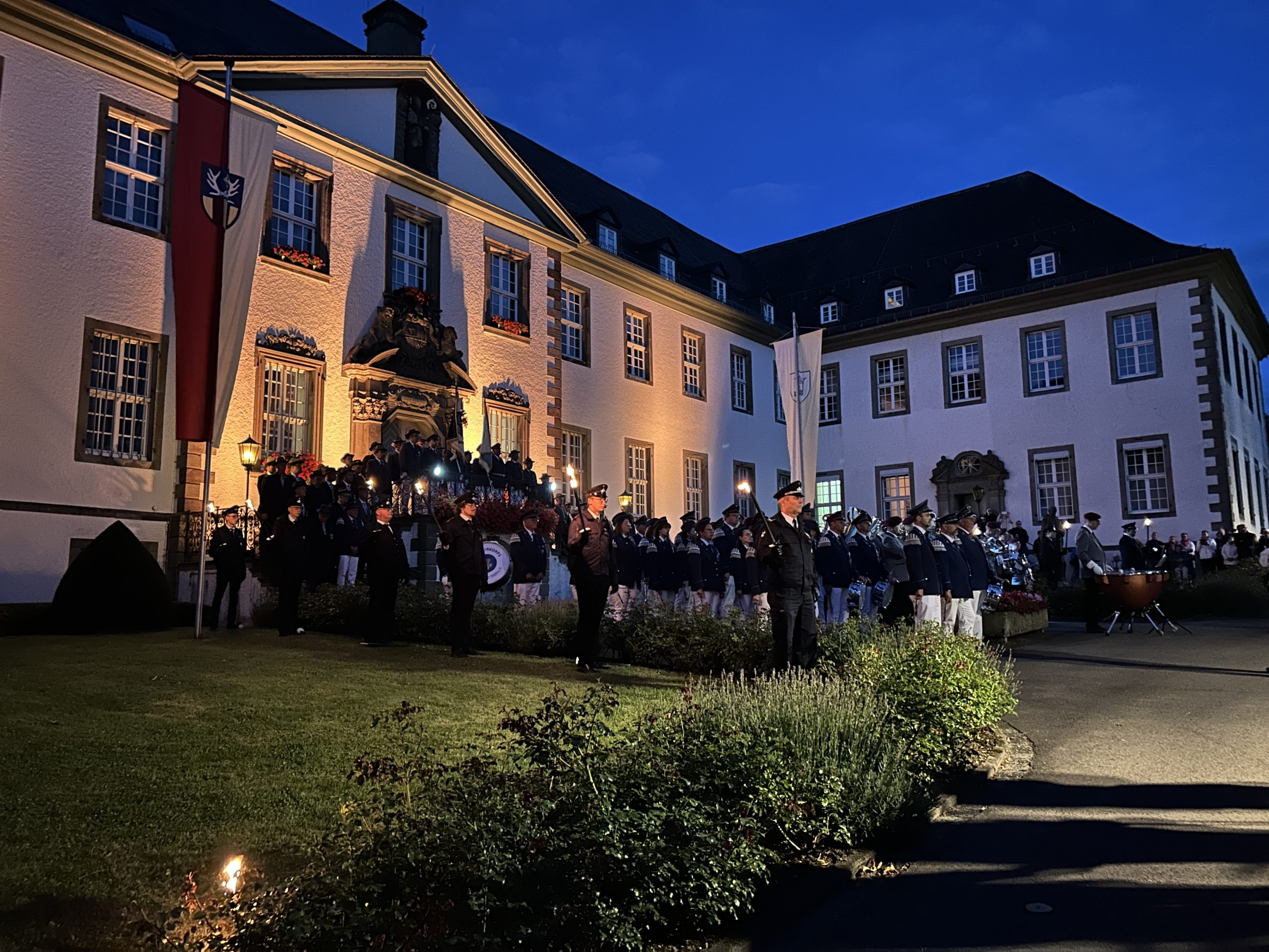 Von der Vogelstange marschierte der Schützenzug ins Klostergelände, wo das Tambourkorps Grafschaft und der Musikverein Berghausen zu Ehren des neuen Kaisers den Großen Zapfenstreich vortrugen. Vor dem angestrahlten Klosterportal entstand auch durch die Fackeln der Freiwilligen Feuerwehr Grafschaft eine besondere Atmosphäre und mehrere hundert Anwesende lauschten bei absoluter Stille einer begeisternden Darbietung.