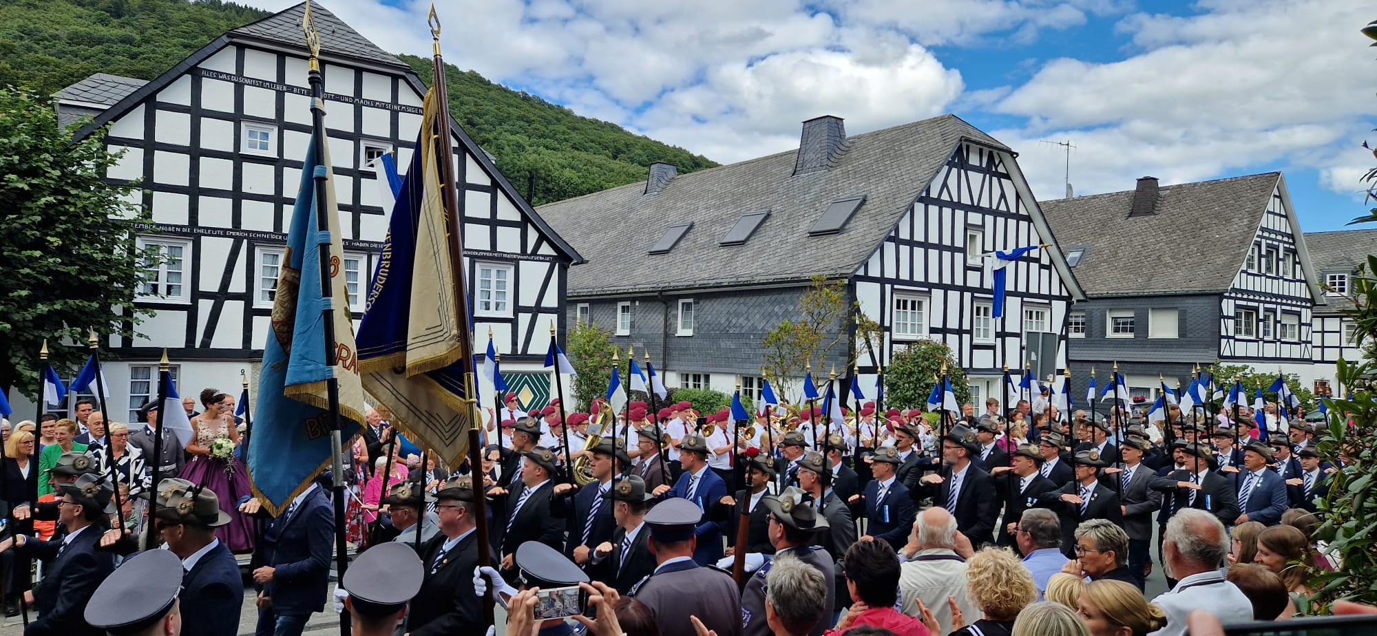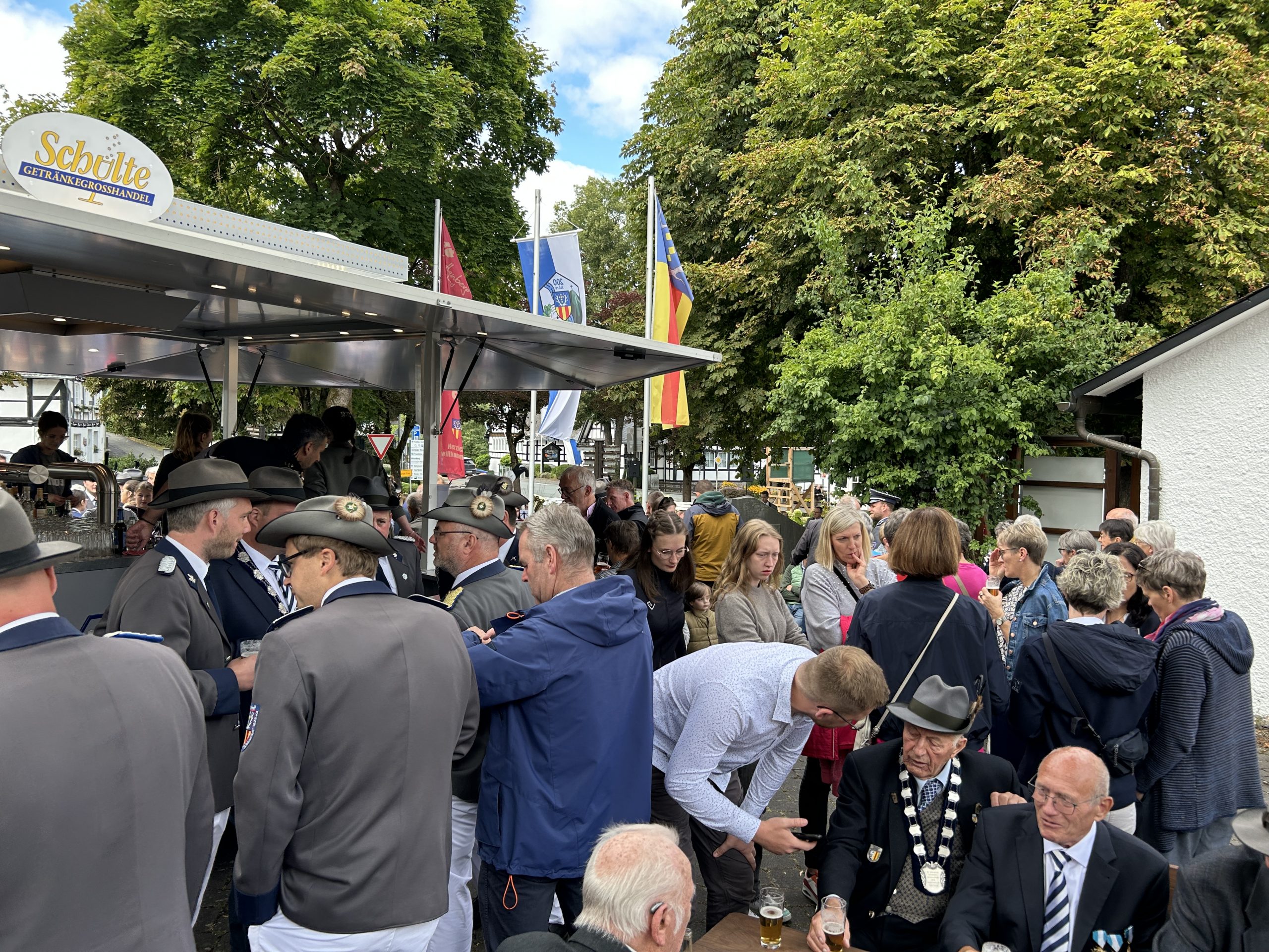 Das Jubiläumsschützenfest zum 200-jährigen Bestehen der St. Sebastian Schützenbruderschaft Grafschaft begann am Samstag, 23.08.2025 mit dem Antreten der Schützen in der Schützenhalle. Der Zug führte zunächst zum Ehrenmal, wo nach einem vom Musikverein Berghausen vorgetragenen Choral die Ansprache des Hauptmanns und die Kranzniederlegung erfolgte.