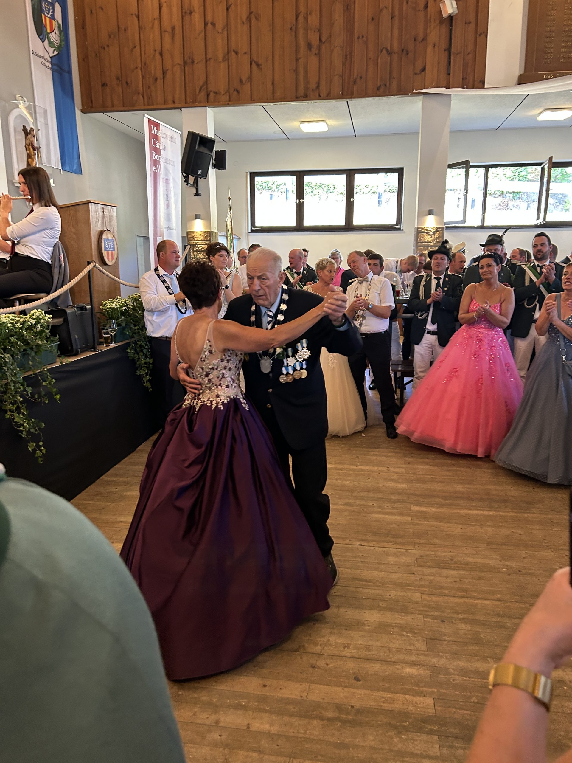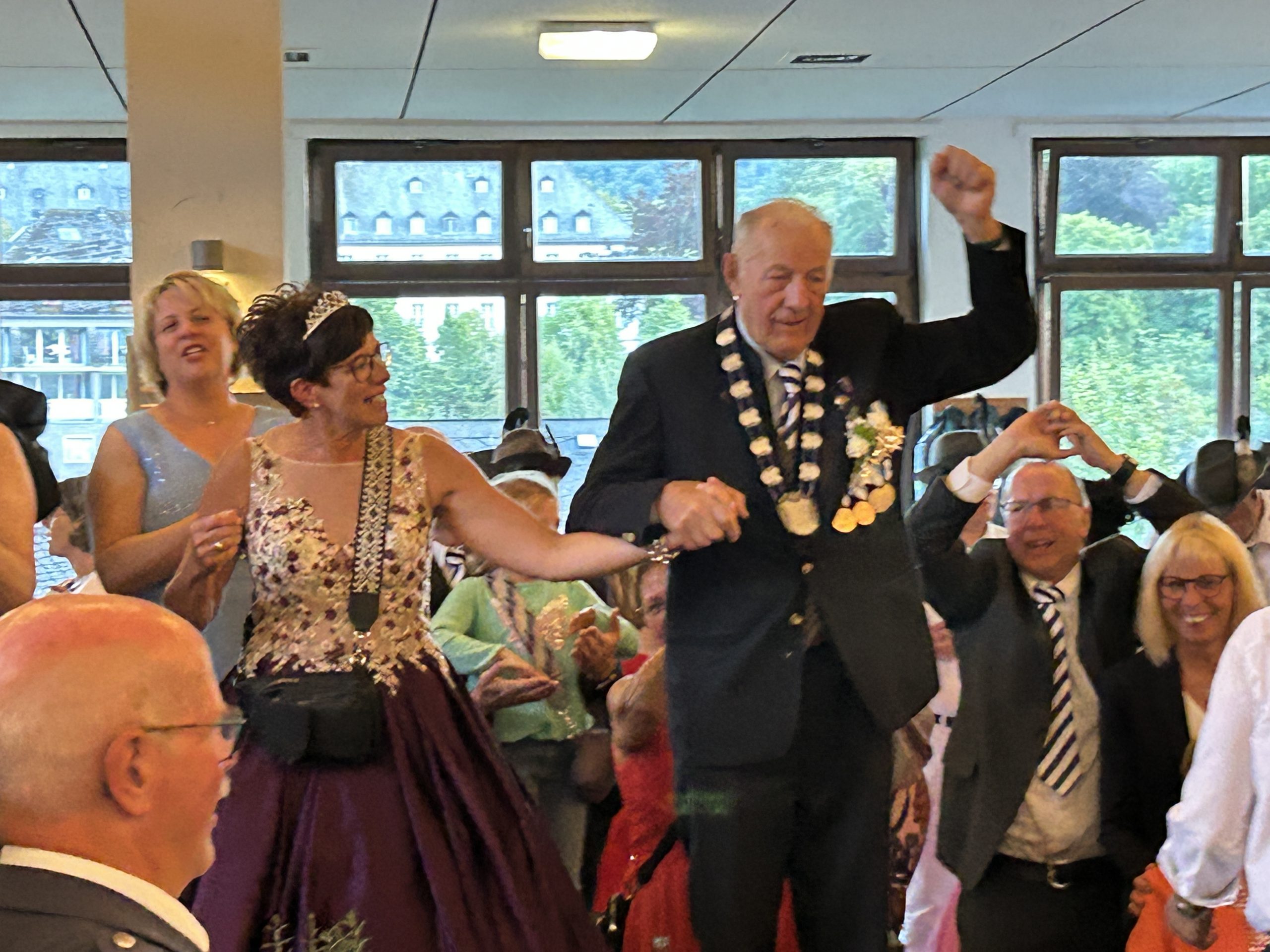 Kaiser Helmut Dohle ließ es sich mit 90 Jahren nicht nehmen, den Kaisertanz auf der Tanzfläche durchzuführen. Kaiserin und Tochter Sabine, Ehefrau Magdalene und die weiteren Kinder und Enkelkinder waren dabei und so entstand ein schöner Tanz im Kreis der Kaiserfamilie, umgeben vom Hofstaat und den Grafschafter und auswärtigen Gästen.