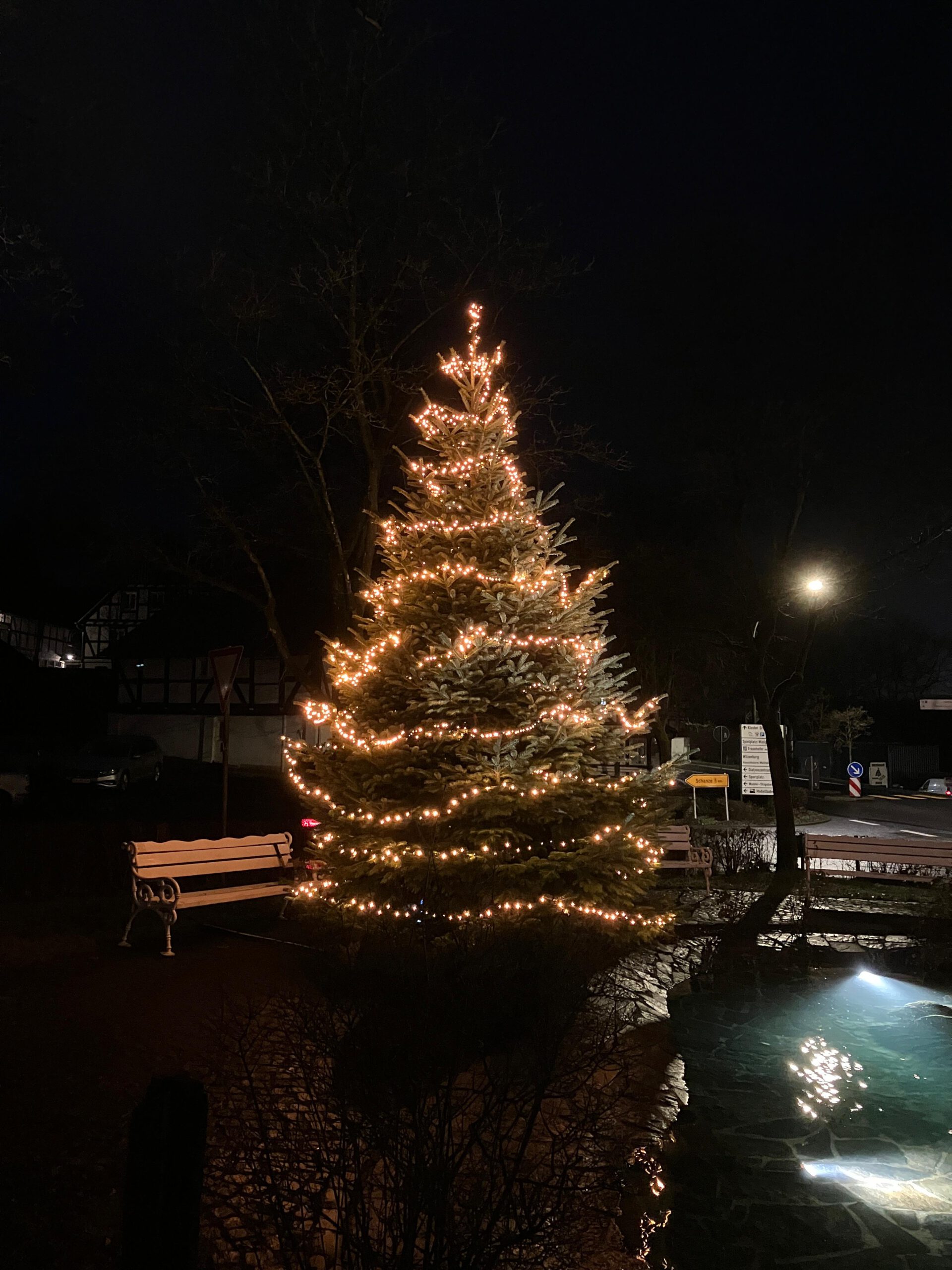 Kurzerhand wurde die farbige Beleuchtung wieder abgenommen und durch den klassischen, warmen Glanz von weiß-goldenen Lichtern ersetzt. So erstrahlt unser Baum nun in traditionellem Weihnachtsglanz, der die Herzen erhellt und perfekt zur festlichen Stimmung in unserem Ort passt.