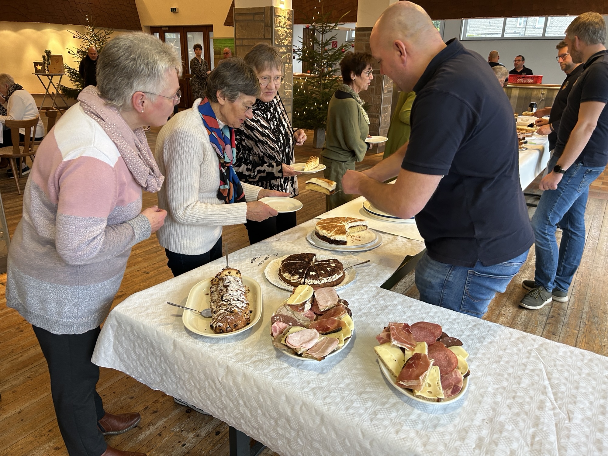 Zum 33. Adventskaffee hatte die Schützenbruderschaft am ersten Adventssonntag in die vorweihnachtlich dekorierte Schützenhalle eingeladen. Etwa 80 Seniorinnen und Senioren, einige Schwestern des Klosters sowie Pastor Stipp, Vikar Jaison und die amtierenden Majestäten waren der Einladung gefolgt. Die von den Vorstandsfrauen gebackenen Torten und Kuchen nahmen reißenden Absatz und bei Kaffee oder Tee wurde sich ausgetauscht und rege geplaudert.